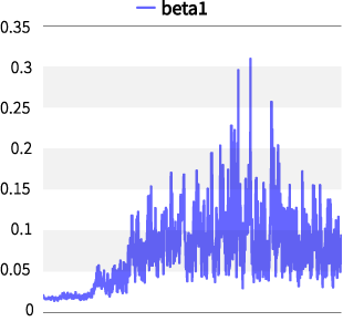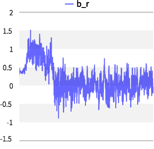 式(11)は共役事前分布なので、事後分布も同じ分布族になることが知られていますが、その様子も確認できました。一般的に、MCMCのサンプリングが上手くいったかどうかは、収束診断や自己相関の確認を行うのが厳密ですが、以下の(図表4)のように乱数の推移で概ね確認することも可能です。 これはトレースプロットと呼ばれ、毛虫のようになっているとMCMCが上手く収束していると言われています。(他パラメータは割愛)