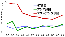 先進国企業は、安価な労働力や輸送費に着目し、アジアやエマージング諸国に生産拠点を置き、コスト面でのメリットを享受し、製品価格を低く抑えてきました。これがインフレ抑制に寄与しました。しかし、2006年以降、アジアやエマージング諸国の物価が急激に上昇しはじめたこともあり、今までの低コストを利用したメリットの構造は変化し始めた模様です。