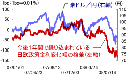 (グラフ6)今後1年間で織り込まれている日豪政策金利変化幅格差(※)と豪ドル/円