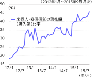 利上げによる金利の先行き不透明感がある中、米国国内では国債に対する個人や投資信託の買入れニーズが高まりつつあるようです。国債の入札における個人と投資信託合計の落札額(購入額)比率は上昇傾向が続いており、9月月間では5割近くに達しています(グラフ6)。