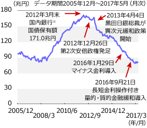 国内銀行※の月次の国債保有額は異次元緩和政策導入後減少し、2012年3月末に171.0兆円であった保有額は、2017年5月末時点で80.8兆円まで減っています(グラフ2)。保有国債の満期償還後にマイナス利回りの国債を新たに購入しにくいことや、金融庁が銀行が保有する債券の金利変動リスクに備えるための規制を見直し、過剰な金利リスクを取る運用から融資や企業再生支援などの事業を促す姿勢を示していることが保有残高減少の背景にあるようです。