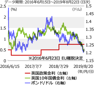 BOEは国民投票により離脱が決定した直後の2016年8月に包括的な景気刺激策として、利下げを含む金融緩和を行いました。それ以降は、ポンド安に伴う輸入物価の上昇によるインフレ圧力の高まりを警戒し、緩やかな金融引き締め(2度の利上げ)(グラフ1)を行ってきました。しかし、ジョンソン政権の誕生により合意なき離脱の可能性が高まる中、2019年4~6月期GDP(速報値)は前期比ー0.2%となり、7月の製造業PMI(購買担当者指数:速報値)は3か月連続で好不況の境目となる50を割り込むなど景気の先行き不透明感が漂っています。8月の金融政策委員会では、政策金利が据え置かれましたが、市場では10月末以降の利下げを織り込む動きが徐々に高まっています。