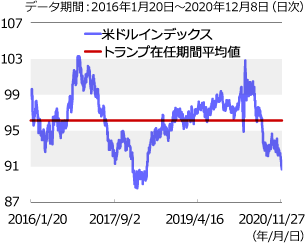 新型コロナウイルス感染拡大による急激な経済活動の停滞から、当初は資金繰りの悪化が危惧されたことで、決済通貨として米ドルの需要が高まりました。3月20日に高値を付けた米ドルインデックス(米ドル実効レート)ですが、その後は世界的な経済活動の再開につれて低下基調となりました。足元ではトランプ大統領在任期間の平均値を大きく下回る水準で推移しています(グラフ1)。ドル安基調が続く背景には、高まった米ドル需要への巻き戻しの動きや米金融当局のゼロ金利政策導入による米国金利の大幅低下があると見られます。