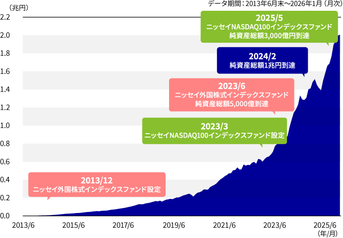 ニッセイアセットマネジメント株式会社(社長:大関洋)が設定・運用するインデックスファンド<購入・換金手数料なし>シリーズ(2026年1月現在:23ファンド)の純資産総額が2兆円に到達しましたので、お知らせ申し上げます。